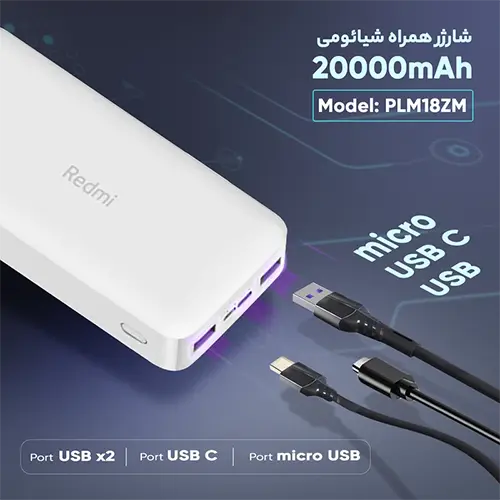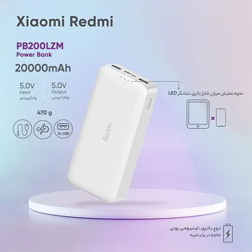 پاور بانک 20000 Redmi مدل PB200LZM ساخت شرکت شیائومی (xiaomi) است. این پاور بانک یک وسیله جانبی پرکاربرد است که نگرانی تمام شدن باتری تمامی وسایل شارژی را از بین برده است. این دستگاه توانایی 4.8 مرتبه شارژ Iphone XS را دارد.