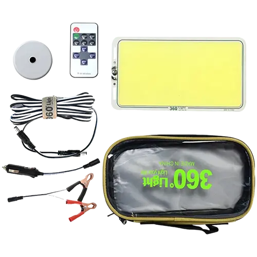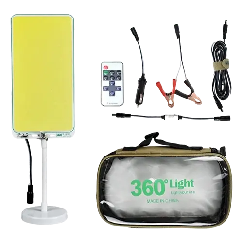 چراغ کمپینگ 360 لایت دارای یک ریموت کنترل نیز میباشد که با استفاده از آن میتوانید شدت نور چراغ خود را تا فاصله 15 متری تنظیم کنید. طراحی این چراغ کمپ منحصر بفرد بوده و نور آفتابی و مهتابی رنگ قابل قبولی را ارائه میدهد. پنل نوری این محصول دارای صفحه متشکل از 252 لامپ SMD با دمای رنگ 6000 کلوین میباشد و میزان روشنایی آن نیز 3950 لومن گزارش شده است.