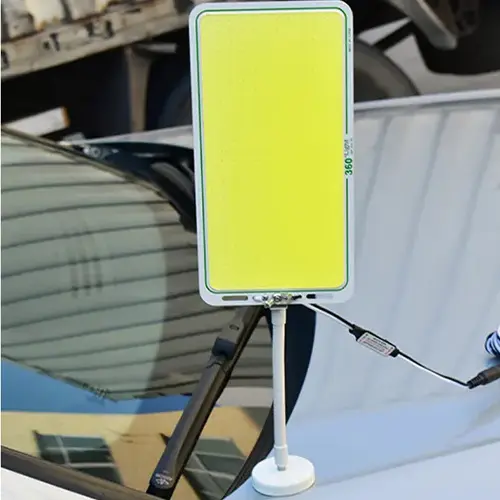 پنل لامپ ,ریموت کنترل از راه دور ,کیف مخصوص حمل ,گیره باتری ,استند آهنربایی ,کابل 5 متری ,میله منعطف متصل به استند ,شارژر فندکی ماشین |